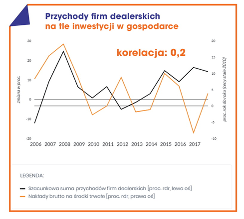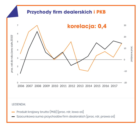 Na początek sprawdźmy korelację z gospodarką tempa wzrostu przychodów firm dealerskich (dane dotyczą lat 2006-2017). Jak mają się one do dynamiki polskiego PKB? Tu korelacja wynosi 0,4 – czyli jest dość istotna, ale na pewno nie bardzo wysoka.
